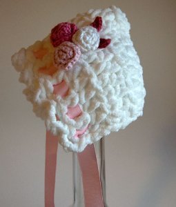 This sweet bonnet couldnt be easier. It works up flat using bulky yarn, and even the assembly is a snap. I think it took me longer to crochet the little roses than make the bonnet itself. Its versatile, too, as you can customize it for either a boy or girl. A great scrap buster is you have some bulky yarn lying around.