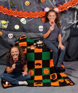 Get your home ready for Halloween with this orange and black crocheted afghan. The Happy Halloween Throw will definitely add a festive touch to your living room. Kids will love curling up on the couch with this crochet blanket as they watch a scary movie or relax after a long night of trick-or-treating. This festive afghan is crocheted in strips and then sewn together. The appliques are made separately, painted, then sewn on.
