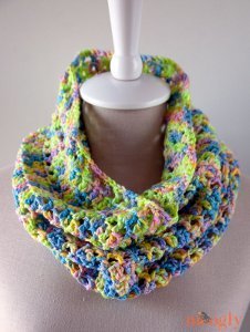 What pretty colors she used! It is true, we all forget about springtime and the chill in the air, and having a fairly open stitch cowl on hand looks like it would give me just enough added warmth without bulk. The color choice reminds me of spring grass and flower buds.