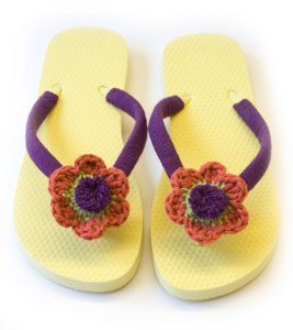 This is a really simple way to jazz up a pair of plain flip flops. This project just calls for wrapping the flip flop thong, but you could just as easily work a Single Crochet instead. You can use the flower pattern included with this post, or use your own favorite blossom instead. The original downloadable pattern from Lion Brand can be found here http//www.lionbrand.com/crochet-pattern-flower-fli == p-flops-1.html