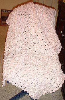 This free baby afghan pattern gives you the sweetest little cuddle soft baby blanket. Work up this blanket as a gift for a baby shower or just a present for the little one in your life. Choose a color based on the gender of the newborn or do a gender-neutral blanket if it's a surprise. Red Heart Baby yarn is used to work up this blanket in rows while the border is worked in rounds. Front post double and back post double crochet stitches make up this blanket.