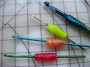 I bought some pencil grips for this very purpose when all the school supplies went on sale. I think two hooks fit as is, but most were way too small. Thats why Im so happy to have found this article. I had thought of wrapping them in yarn first, but never thought of using rubber bands instead. I have the perfect thin bands, too, so I can really control the thickness.