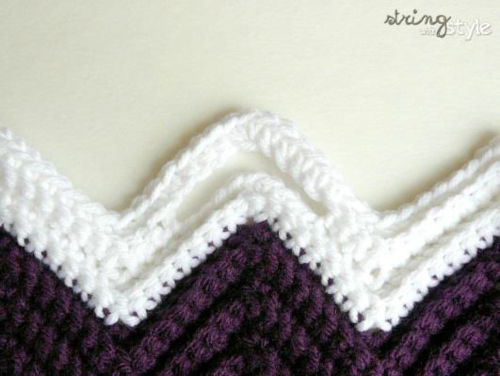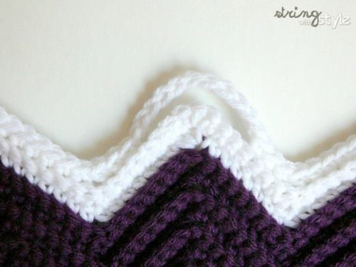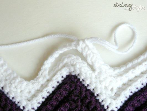 Note: I recommend that you change colors only at the end of even rows so that every new color begins on an odd row. On my blanket, each stripe is 6 rows tall, for a total of 8 stripes.