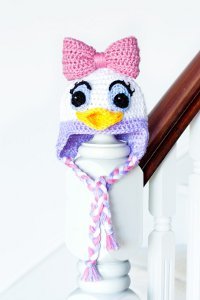This Cartoon Crochet Baby Hat was inspired by none other than Disney's Daisy Duck. Perfect for any little girl in your life, this crochet hat pattern features an oversized bow, braided tassels, earflaps, and an adorable duck face that's nearly impossible to resist. This free crochet hat pattern is designed to fit babies 3-6 months old. Work up this crocheted hat for your own little one, or make one for an expectant mom. Homemade crochet patterns like this make excellent baby shower gifts.