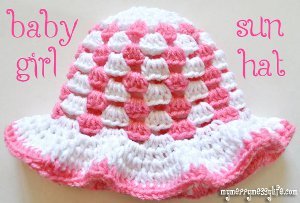 Protect your baby's face from the sun with this Granny Stitch Sun Hat. Pink and white yarn makes this crochet pattern perfect for baby girls, but you're welcome to change the colors to make this hat a little more masculine for baby boys. This crochet hat works up quickly and is made using the granny stitch. It's written to fit babies about 3-6 months old. Worsted weight yarn is used for this cute crochet hat.