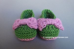 This is a nice basic shoe pattern that you can adorn with the bow as suggested, or use other embellishments to suit your fancy. The pattern is available on the page in both English and Spanish, however, there arent any photos or diagrams other than the finished project. Its not a hard project, but photos are always appreciated.