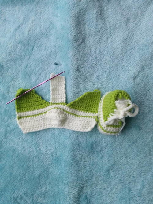 Row 1: (With colour B) SS to the left side of the sneakers Ch 1, turn, 1 Sc in the 1st stitch, mark stitch, 1 Sc in of the next 13 stitches. Total 14 stitches.