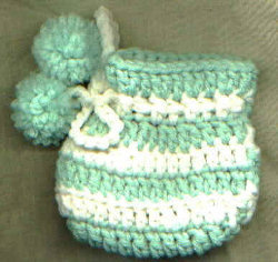 These green and white booties are cute for a baby six months to a year. They would make for great St. Patrick's day booties. Worsted weight yarn and an F hook are required.