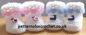 Crochet these Cutie Patootie Baby Booties for the little one in your life. You'll love seeing the sweet pitter patter of baby feet wearing these precious homemade baby booties. This is an easy crochet pattern to complete for either boys or girls using blue or pink light worsted weight yarn. The crochet instructions for these cute booties are written to fit newborn babies or dolls. Make a pair for your own little bundle of joy, or give a pair as a homemade baby gift.