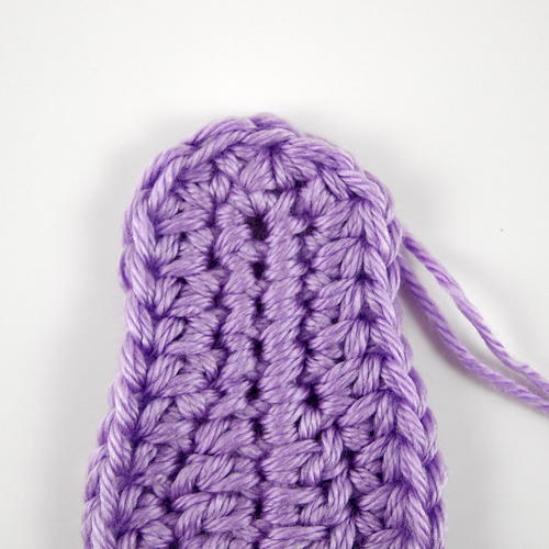 Attach main color in the 6th sl st from the center of the heel and make the first sc of Round 1 in the next sl st.