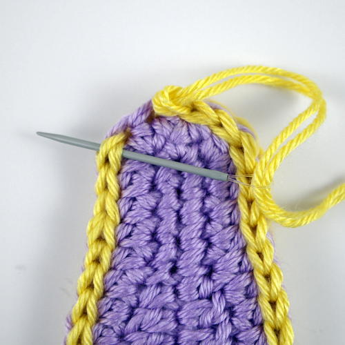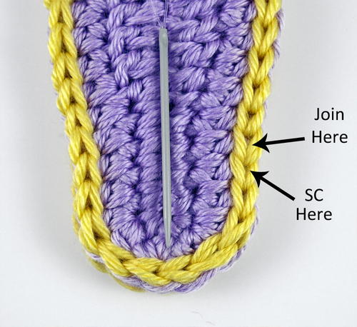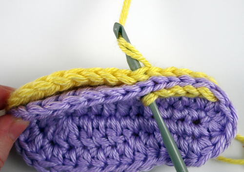 Slip Stitching the Soles Together: Place one of each color of sole together with wrong sides facing and your accent color on top, making sure to line up the stitches. With two strands of your main color, slip stitch through both layers of stitches from the last round.