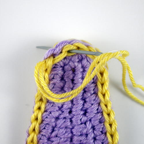 Invisible Join for SC or HDC: Weave the yarn tail under both loops of the second stitch to the left, then back through the center of the last stitch made. Pull the tail just tight enough so that it looks like the other stitches.