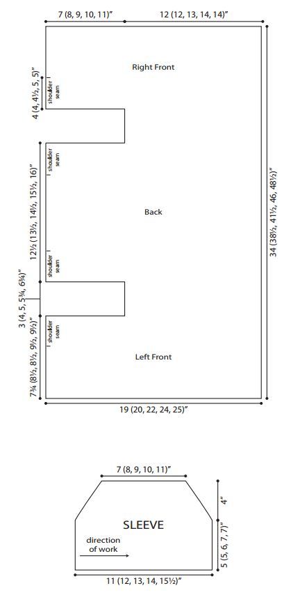 Finished SizeSmall (Medium, Large, 1X, and 2X) to Fit Bust: 32 (36, 40, 44, 48)”; Finished Bust: 34 (38 ½, 41½, 46, 48½ )”; Finished Length: 19 (20, 22, 24, 25)”