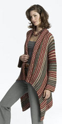 This is almost a duster. I love this asymmetrical hem on this jacket. I love the colors used it. The finished project looks appropriate for the fall and winter months. I love that there is also a collar on this jacket.
