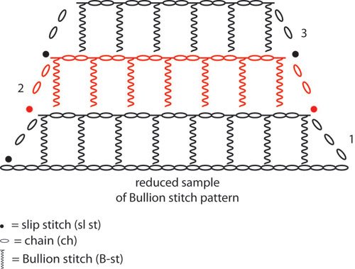B-st: Bullion stitch—[Yarn over] 7 times, insert hook in indicated stitch or space and draw up a loop, yarn over and draw through ALL loops on hook (ease through each loop, rather than pulling through all of them at once).