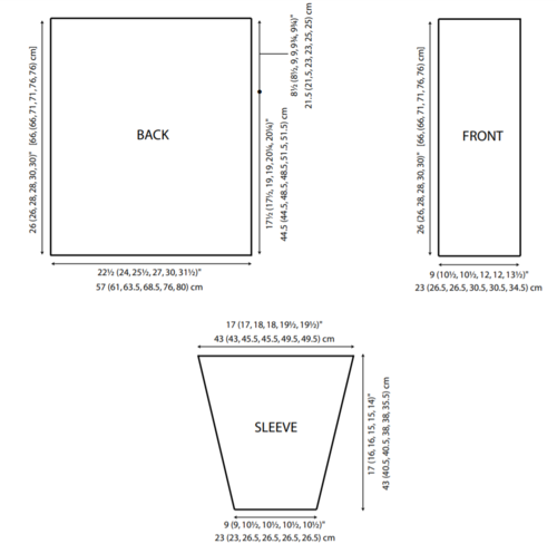Finished SizeFinished Bust: 40½ (45, 46½, 51, 54, 58½)" [103 (114.5, 118, 129.5, 137, 148.5) cm] Finished Length: 26 (26, 28, 28, 30, 30)" [66 (66, 71, 71, 76, 76) cm]
