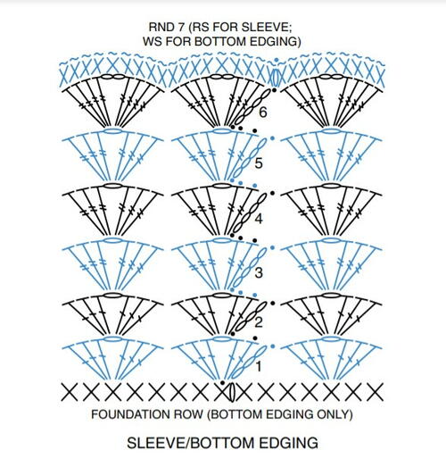 Round 1: With right side facing, join yarn in first sc after side seam; ch 3, (2 dc, ch 1, 3 dc) in same sc, skip next 4 sc, * (3 dc, ch 1, 3 dc) in next sc, skip next 4 sc; repeat from * around; join with a slip st in top of ch-3 – 8 (8, 9) shells.