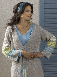 The most important thing I'd change would be to the neck to make it have a softer line - perhaps adding a row of shells, which would also act as buttonholes I'd also put the color section of the sleeve down by the cuff. Also, I'd probably take out the tie belt and perhaps add a few buttons.