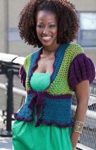 If you've never seen crochet jacket patterns for women, you must check out this Short Puff Sleeve Jacket from the Double Stitch twins. You can wear this jacket to complete your outfit on a nice summer day. The cluster stitch is used giving it a nice texture and feel.