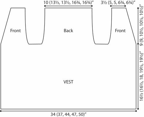 Vest is worked in one piece from lower edge up to underarm. The piece is then divided for armholes. The back and fronts are then worked separately up to shoulders.