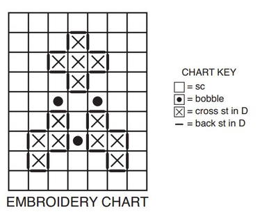 Row 4: With A, ch 1, sc in first 3 sc, *change to B, bobble in next sc, [change to A, sc in next 6 sts, change to B, bobble in next st] twice*, change to A, sc in next 7 sts, repeat from * to * once, sc in last 3 sc; turn6 bobbles.