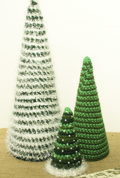 I generally dont like the modern look for my decorations but I actually like these. Although they are designed to fit over Styrofoam cones, you can lightly stuff them and work a round circle for the bottom. I would add a small baggie of beads, beans or rice at the bottom to weigh down the tree. A grouping of these would look nice on the mantle or a table.