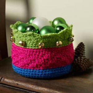 This is an adorable little basket. I love the different colors, the texture created by the various stitches, and the little jingle bells at the top. Tripling up on the yarn gives the basket its strength. That allows the crafter to use just about any yarn on the market (except the finer baby yarn). The shell detail on top really adds to it as well.
