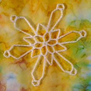 This is a really pretty snowflake and it is a fairly large one with the span of four inches. I see that the designer used glue as a stiffener for this flake and I know from experience that it is a good medium. My Mom made dozens of snowflakes and I have been attempting to get them reshaped as they have been in store. Word to the wise, use the glue sparingly.