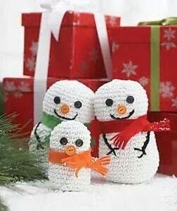 I just love this little snowman family. Its such a great amigurumi project for a beginner, too, since there arent any complicated additional parts. The only thing I would change is that instead of making the decreases after stuffing the snowmand, Id rather have a flat disc on the bottom so they can stand on their own. Ive also had good success with similar projects by tucking in a baggie of dry popcorn to give them some weight.