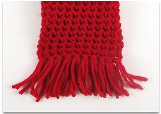 Scarf Fringe: Cut 20 pieces of yarn that are each 5" in length. Use 2 pieces of yarn per stitch to add fringe along the bottom edge of the scarf. Trim the ends to an even length.