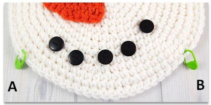 Turn your work so the stitch markers are at the top. With the right side of the Snowman facing you, slip stitch to join Color Red in the Front Loop only of marked stitch A. The first round will be worked in the front loops only across to Marker B, then the piece is turned and you will work in the back loops only of the same stitches back to Marker A.