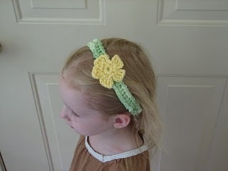 When my children were growing up, we lived on a 100 acre farm. Every summer, daughter Rachel would look forward to buttercups and daisies starting to bloom. Instead of using regular elastic as the designer suggests, I used a purchased elastic headband from the dollar store. I followed the rest of the instructions for the band and flowers, but added a few crocheted daisies to keep the buttercup company. She loved it!