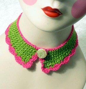 Add a pop of color to any outfit with this Crocheted Ruffle Collar. Lion Brand Bonbons yarn is used for this free crochet pattern. The directions are for a child size collar, but can be easily adjusted for a larger version. Collars are quick and easy way to dress up any outfit. The bright pink and green colors shown here make this the perfect fashion accessory to wear for special occasions like Easter, weddings, and birthday celebrations.