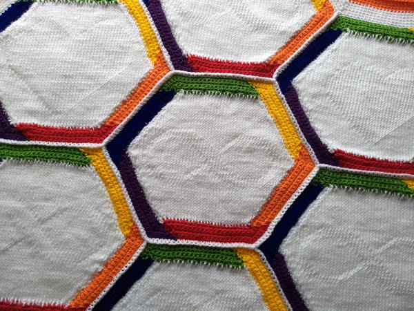From the blogger: "This is worked with Brava Worsted from WeCrochet/KnitPicks. (1 ball each of six colors, 5 balls white) It uses Tunisian Crochet for the white hexes and regular single crochet for the borders. Includes video tutorial for rainbow borders and written instructions. This pattern comes with three hex design options - the infinity symbol, hollow heart, or solid heart. Mix and match to make a blanket for someone you love with Autism. Spread some autism love!"