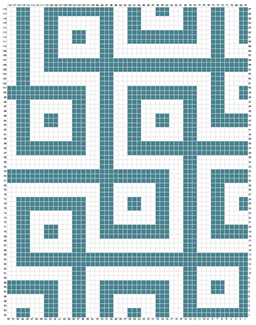 The graph alone can be used to create the blanket. One square on the graph represents one C2C stitch. The blanket is worked from the bottom right corner of the graph and is worked up one row and down the next. All odd row start at the bottom of the graph and work upwards diagonally and all even rows start from the right side of the graph and work down diagonally.