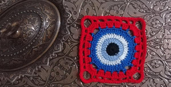 "The Evil Eye is an eastern talisman designed to ward off bad luck which is contemporarily widespread on every continent. Especially Turks believe jealousy is at the root of the power of the evil eye, whether in the form of a malicious or admirable look. Therefore almost every Turkish person has one to carry around with them or display in their home even though they think it is just a superstition. So here is a very easy and free crochet evil eye square pattern for you to use in your projects. By the way, it is called Nazar Boncugu in Turkish. (Türkçe tarif için okumaya devam et)"