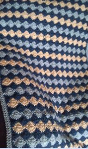 I was expecting a more vibrant color scheme for this Crochet in the Sky with Diamonds Afghan. Probably gold or sunny yellow in diamond design, not blue or pink. Anyway, anything goes so the crocheter of the original design obviously has something else in mind.