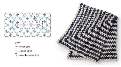 Cont in rnds as before, working (Ch 1. 3 dc) in ch-1 sps and (3 dc. Ch 3. 3 dc) in corner ch-3 sps, working 2 rnds each in A and B until shorter side of Blanket measures approx. 56” [142 cm]. Fasten off.