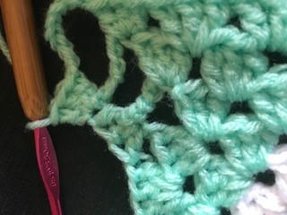 Rnd 2: (mint) Ch 2, 2dc, ch8, 3dc in first corner, 3dc chn 8, 3dc in each of the next 3 corner spaces. Join with sl st to top of beginning ch 2. Sl st in back loop only to the closest granny space.
