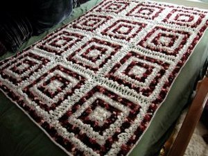 Getting in the groove with this squares afghan. Its an awesome pattern and is truly groovy. This blanket is very masculine in the color choices and will work great in all three of my sons rooms or I could just make one for the family room and let them share. Love the Crochet Dude.