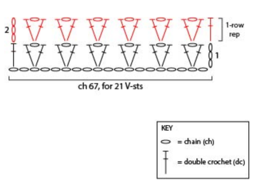 Row 1: V-st in 5th ch from hook (4 skipped ch count as 1 base ch and first dc), *sk next 2 ch, V-st in next ch; rep from * to last 2 ch, sk next ch, dc in last ch – at the end of Row 1, you will have 21 V-sts and 1 dc at beg and end.