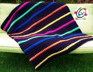 Let your imagination run free with this Modern Classic Striped Afghan. This particular blanket was crocheted with black as the main color and a variety of bright colors for the stripes. Of course, this is just one of the many color combinations you can use to work up this free crochet afghan pattern. The striped design itself is classic and timeless, while the bright colors give the afghan a modern look. You can use either worsted weight yarn or bulky yarn to complete this crochet afghan pattern.