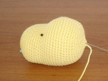 - And one more time, wrap the yarn over one stitch (where a pin for the eye was placed or where eye place will be created) and push the needle through the head, towards mouth corner or last pin there is to be worked.