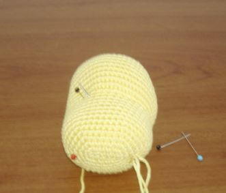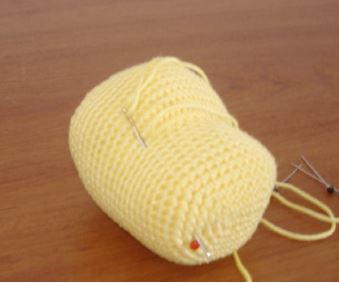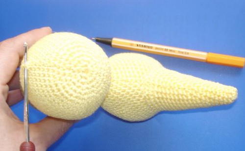 Before creating backbone ridge, tail to the body has to be added and sewed. Place the tail (looking from the bottom of the body) right after 5th round. The tail has to be centered in the back. Stuff it very well and very firm, pin it all the way and sew around.