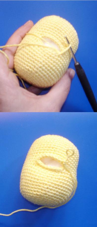 - Pull the needle out, wrap it around one stitch here and push the needle towards the bottom head opening (for easier tying the yarn and hiding yarn later).