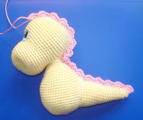 Little piece of advice: I have worked with pink colored both rows when crocheting backbone ridge. I suggest you use the same color yarn you used for the body when crocheting the first row and change the color before starting the second row. This way, even if you make little mistake crocheting the first row directly through stitches on head, body, tail, they will not be so visible and your work will look perfect. - To make it as easy as possible, as we have to crochet creating straight line over the head, back and tail area, I used sharpie in the light color, matching the color of the yarn I used (so it doesn’t show and can’t be seen later) and simply draw the line I will crochet over.