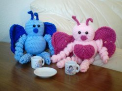 I dont really understand why this project is classified as an Advanced pattern. The heads and bodies are very basic amigurumi (the designer says this was her very first), the heart shaped wings based on granny squares and the limbs are curly cues. No tricky stitches at all. The post does need some more photos especially where it comes to the assembly portion. This would make a cute lovey for any time of year.