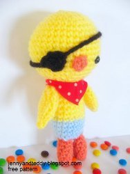 Don't say a peep or you'll walk the plank. With his tiny eye patch and little bandanna, this crochet toy chick has some attitude. He's just too cute not to take orders from.