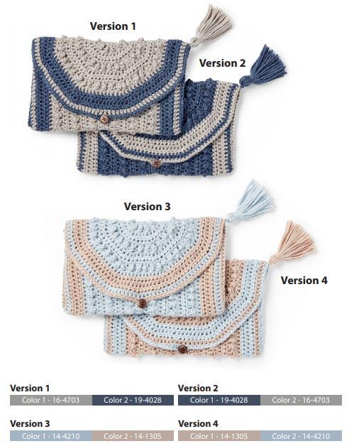 Cut a piece of cardboard 4" [10 cm] wide. Wind Color 1 around cardboard 30 times. Break yarn leaving a long end and thread end through needle. Slip needle through all loops and tie tightly. Remove cardboard and wind yarn tightly around loops ¾" [2 cm] below fold. Fasten securely. Cut through rem loops and trim ends evenly. Sew Tassel to top right corner of Clutch as seen in picture.