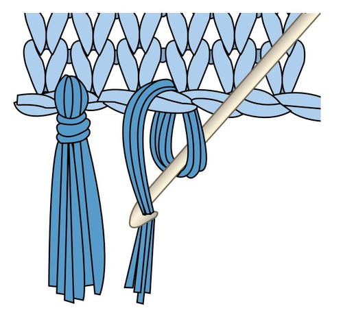 With 2 strands of A held tog, ch 56. Sl st in back “bump” of 2nd ch from hook and each ch to end of chain. Fasten off. Sew to bag as shown in diagram below.